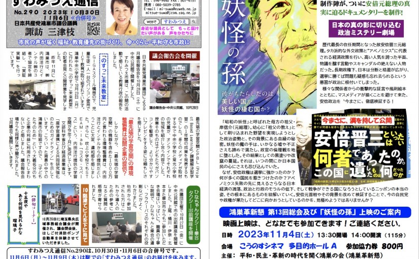 すわみつえ通信 議会報告会を開催「のすっこ未来教室」「最先端の学習空間」の環境整備費は民間企業の提供?ひなちゃんタクシー・乗合タクシー出前講座を開催10階建てビルを下に見て2023年11月4日(土) 鴻巣革新懇 第13回総会及び「妖怪の孫」上映のご案内