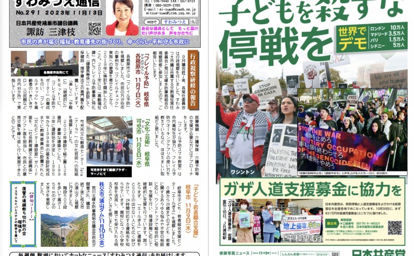 すわみつえ通信 行政視察研修の報告●「フレイル予防」岐阜県各務原市11月7日(火)●「文化・芸術」岐阜県可児市11月8日(水)●「子ども・若者総合支援」岐阜市11月9日(木)●秩父市「浦山ダム」11月10日(金)ガザ人道支援募金に協力を